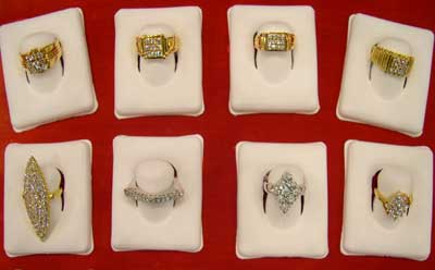 Set in beautifully handcrafted deigns set as Rings in 22kt and 18kt Gold. Can also be customized as per your choices.Visit Diwan Jewels in Meena bazar to see the collections. whats app orders-0505985597 We accept payments credit cards and major currencies.