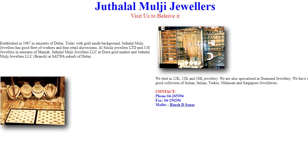 Established in 1967 in emirates of Dubai. Today with gold smith background, Juthalal Mulji Jewellers has good fleet of workers and four retail showrooms. Al Silsila jewellers LTD and J.M Jewellers in emirates of Sharjah. Juthalal Mulji Jewellers LLC at Diera gold market and Juthalal Mulji Jewellers LLC (Branch) at SATWA suburb of Dubai.
