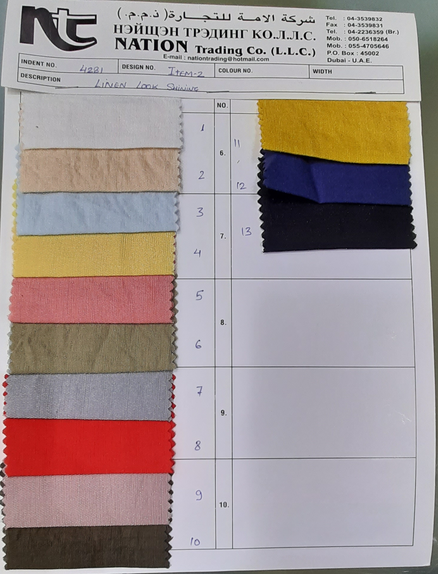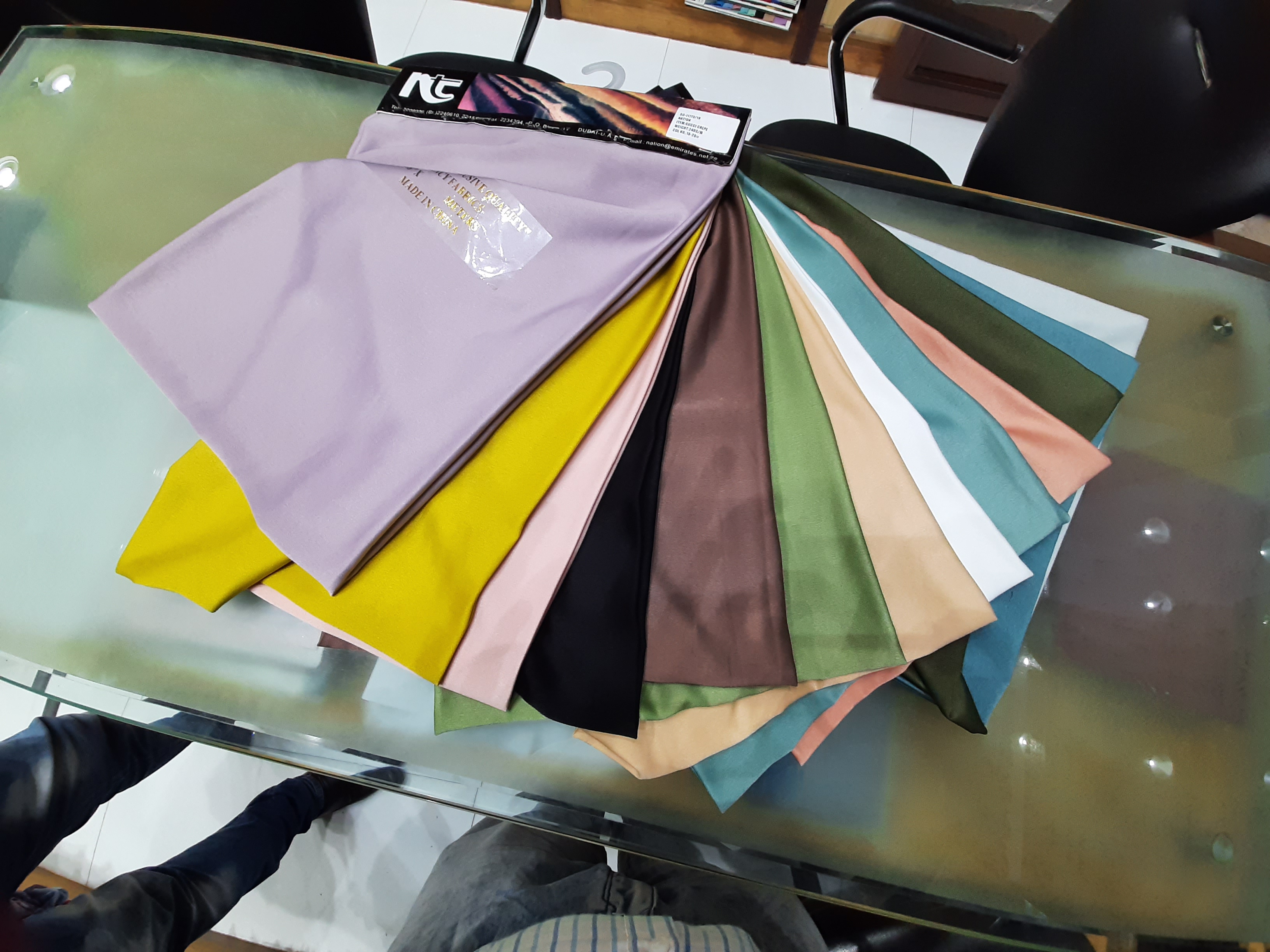 Nation Trading is trading in ladies dress materials like Printed & Plain Dyed, in Knitting, Woven, Chiffon's, Satins, Wool Peach, Lorenzo, Laces, Linens & Cotton Embroidery and Brockeds & Jacquards. Nation Trading Imports material from Korea, Indonesia, China, Vietnam, Taiwan & India.