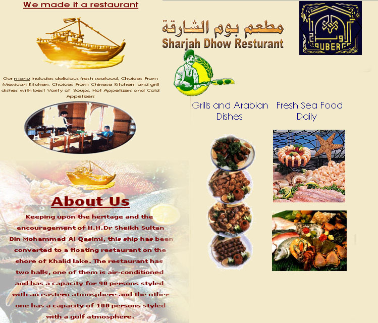 عربىKeeping upon the heritage and the encouragement of H.H.Dr Sheikh Sultan Bin Mohammad Al Qasimi, this ship has been converted to a floating restaurant on the shore of Khalid lake. The restaurant has two halls, one of them is air-conditioned and has a capacity for 90 persons styled with an eastern atmosphere and the other one has a capacity of 100 persons styled with a gulf atmosphere.
